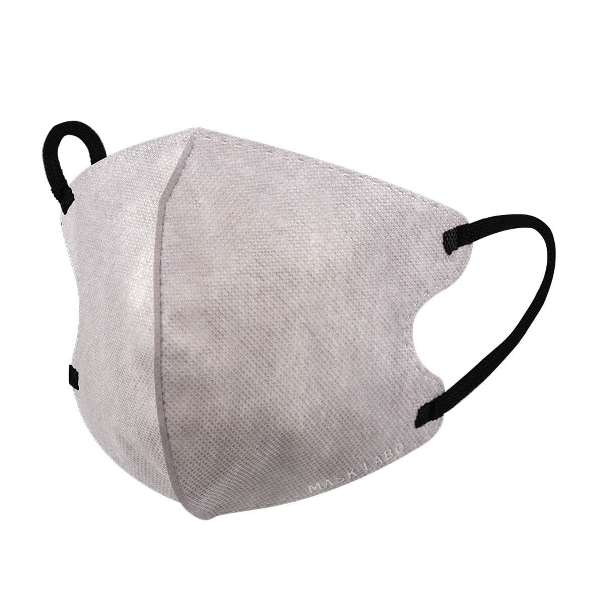 MASKLABOのロゴが下になるようにマスクを開き、鼻からアゴまで覆うように顔にフィットさせ、ゴム紐を耳にかけます。